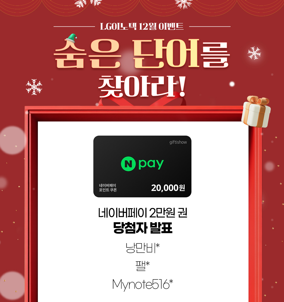 지난 12월 진행된 ‘LG이노텍 12월 EVENT #숨은 단어 찾기’에 참여해주신 모든 분들께 감사드리며, 당첨자를 발표합니다!