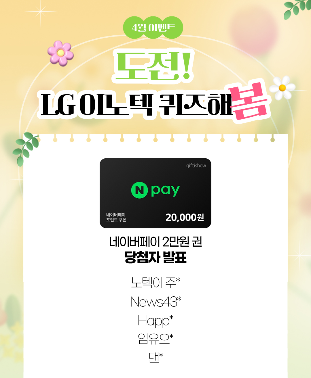 이번 4월 초 진행된 ‘LG이노텍 4월 EVENT #도전 이노텍 퀴즈해봄’에 참여해주신 모든 분들께 감사드리며, 당첨자 5명을 발표합니다! 😊