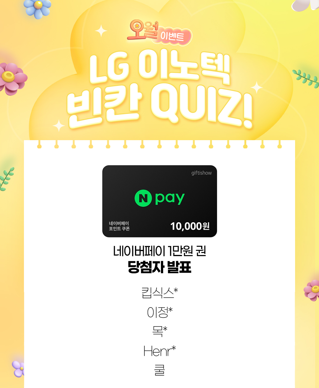 이번 5월에 진행한 ‘LG이노텍 5월 빈칸 퀴즈 이벤트’에 참여해주신 모든 분들께 감사드리며, 행운의 당첨자 5명을 발표합니다😎