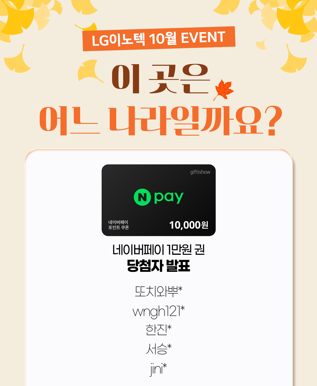 LG이노텍 10월 이벤트 ‘이 곳은 어느 나라일까요?’에 참여해주신 모든 분들께 감사드리며, 행운의 당첨자 5명을 발표합니다🙌