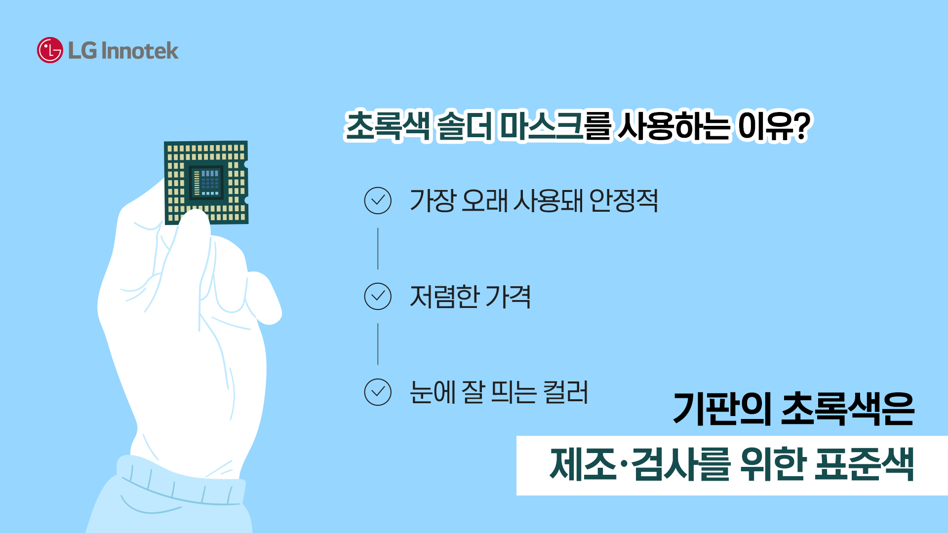 초록은 미관이 아닌 제조·검사를 위한 표준색이라는 점을 기억해 주세요!