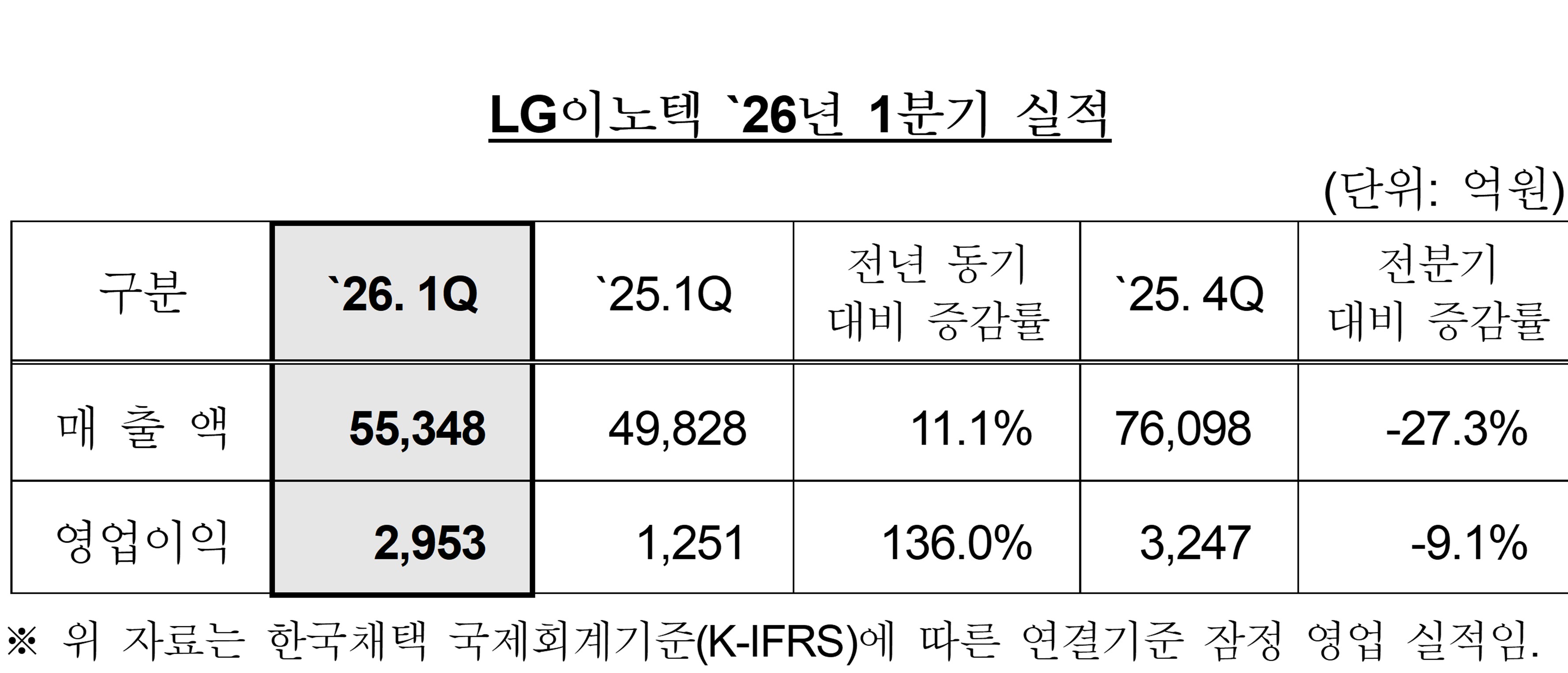 LG이노텍이 시장 기대치를 뛰어넘는 실적을 달성했다. LG이노텍(011070, 사장 문혁수)은 한국채택 국제회계기준(K-IFRS)으로 2026년 1분기 영업이익이 2,953억원으로 잠정 집계됐다고 27일 밝혔다. 이는 전년 동기 대비 136% 증가한 수치다. 매출 역시 전년 동기 대비 11.1% 증가한 5조5,348억원으로, 1분기 기준 역대 최대치를 기록했다.