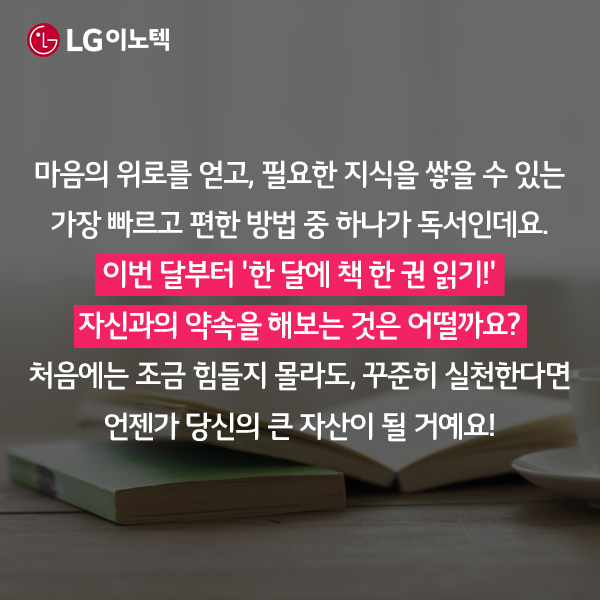 People&Culture 당신은 지금 무슨 책을 읽고 있나요? 2017. 4. 4. 18:12 공유하기 게시글 관리 LG이노텍 Newsroom 저작자표시 비영리 변경금지 (새창열림) 'People&Culture' Related Articles LG이노텍의 지속가능경영 활동! 화제의 중심, G6에 탑재되는 LG이노텍 제품은? 직장생활 중 맞이하는 난감한 상황, 당신의 선택은? 동반성장에 앞장서는 LG이노텍!