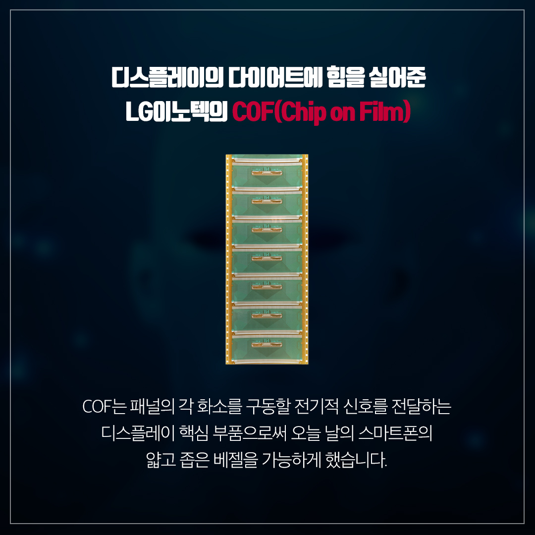 COF 디스플레이 패널과 기판을 연결해 패널의 화소를 구동할 전기적 신호를 전달하는 필름 형태의 디스플레이 핵심 부품입니다