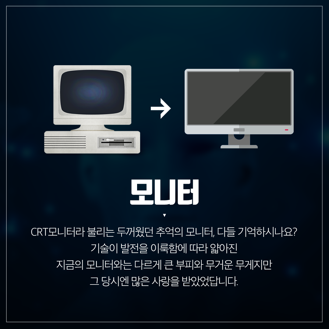 초기의 모니터는 일명 뒤통수 나온 모니터라 불리는 CRT 모니터였습니다.모니터였습니다.