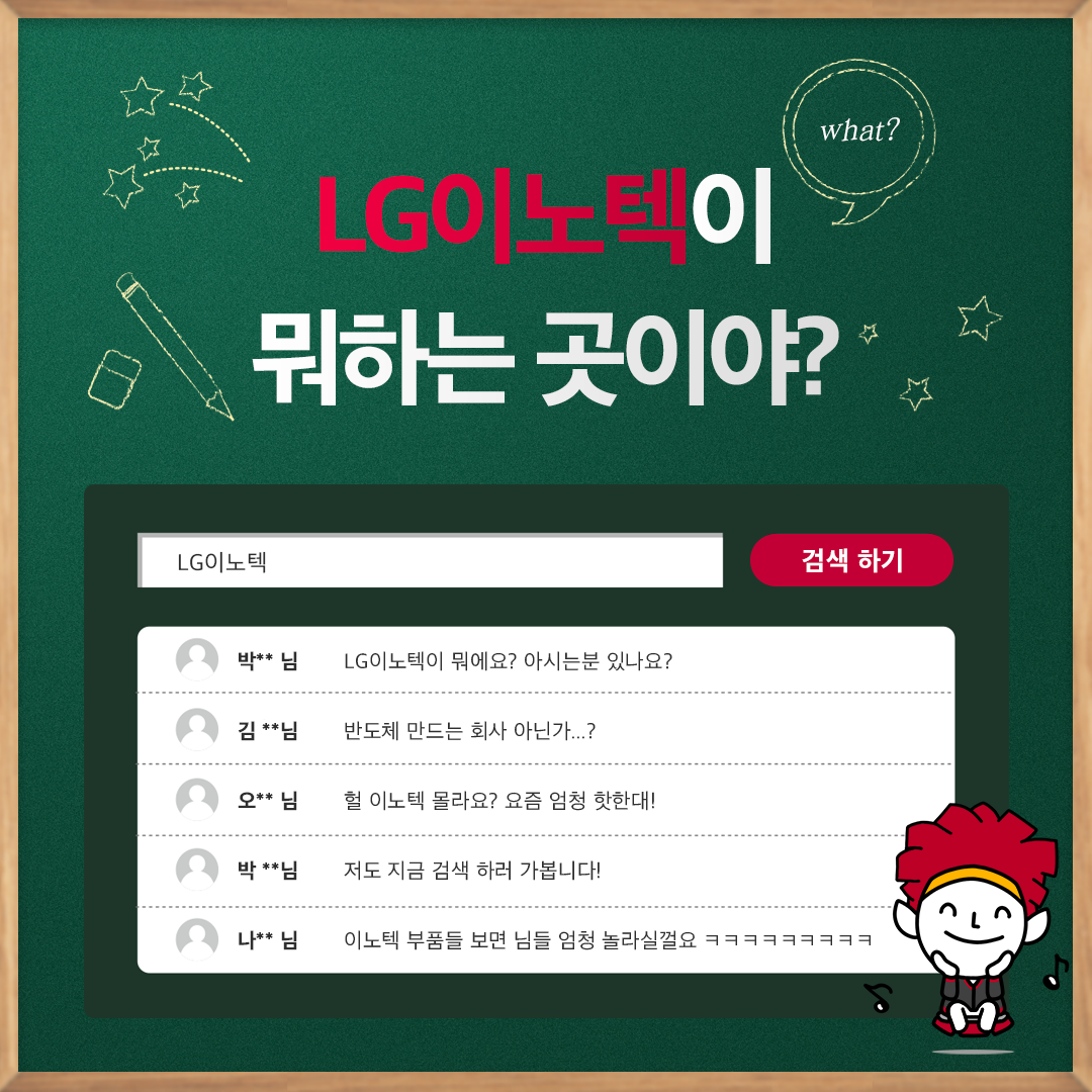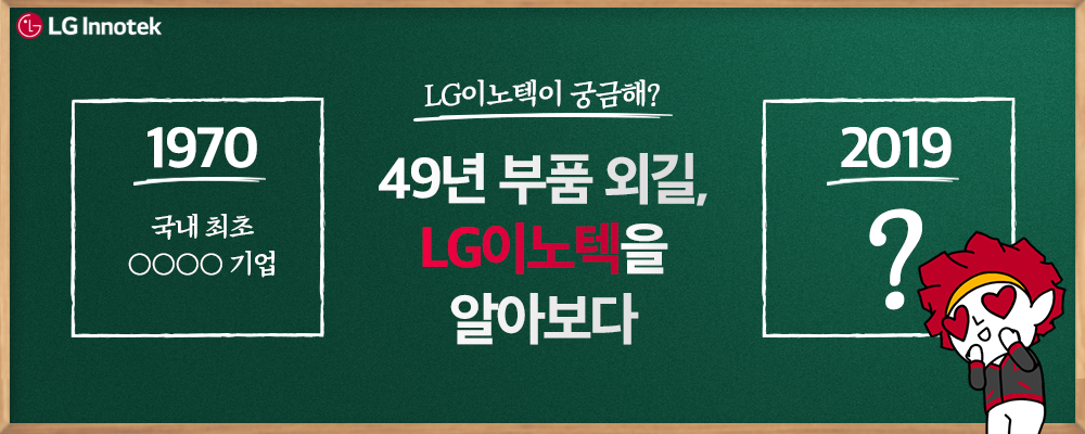 LG이노텍은 1970년에 설립된 대한민국 최초의 전자부품 기업으로 현재 모바일, 자동차, IoT, 디스플레이, 반도체 영역에서 최첨단 소재 부품을 선보이고 있습니다. 그 중 카메라모듈, 포토마스크, COF 등은 수년간 글로벌 1위를 유지하며 시장을 선도하고 있습니다.