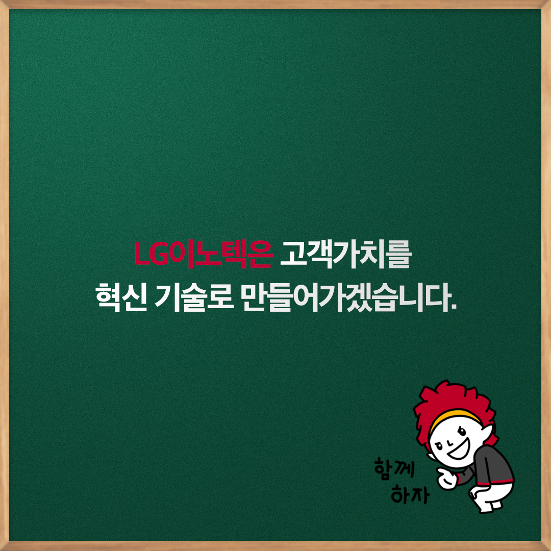 LG이노텍 임직원들은 ‘고객가치’를 모든 의사 결정과 업무 수행의 판단 기준으로 삼아 ‘새로운 시도’로 시장에서 변화와 혁신을 주도하고 차별화된 고객가치를 지속 발굴하며, ‘집요한 실행’을 실천합니다.