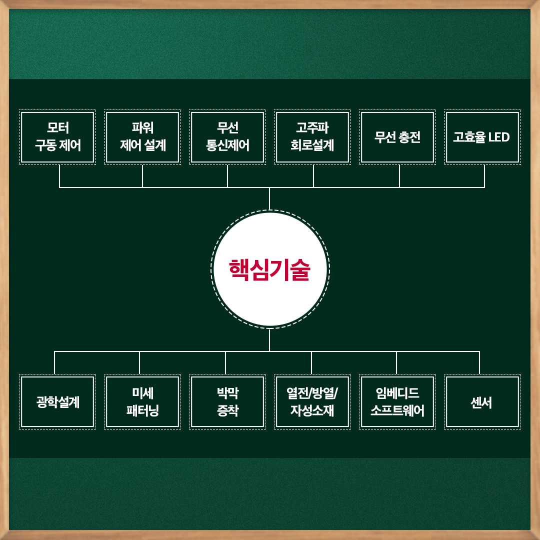 LG이노텍은 뛰어난 R&D 역량과 완벽품질을 기반으로 혁신 제품을 생산하고 있습니다. LG이노텍은 모터 구동 제어, 파워 제어 설계 등 12개의 분야의 핵심기술을 보유하고 있고 전 임직원의 50%가 R&D 인원일만큼 연구개발에 힘쓰고 있습니다. 또한 글로벌 품질 경영 시스템 기반의 품질 혁신 및 관리 활동으로 완벽품질을 추구하고 있습니다.