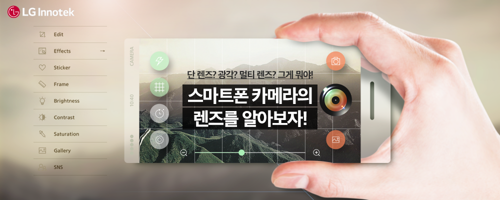 최근 LG이노텍은 스마트폰 카메라의 혁신을 이끌만한 다섯 개의 카메라라 들어간 모듈을 선보였습니다. 전면 2개, 후면 3개로 스마트폰 한 대에 5개. 즉, 펜타(penta) 카메라 모듈 양산에 성공한 것이죠. LG이노텍의 부품이 채용된 스마트폰 후면의 트리플 카메라는 어두운 곳에서도 잘 찍히는 조리개 F1.5의 일반 카메라와 더 넓은 시야를 제공하는 초광각 카메라, 그리고 먼 곳을 가깝게 잡아주는 망원 카메라가 모두 탑재되어 있습니다.