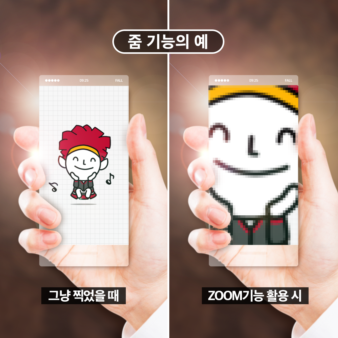 이러한 확대 방법은 전체 화면 중 일부 정보만을 확대 표시하는 것이므로 화질이 떨어지죠. 줌을 많이 당기면 사진이 깨지면서 선명하게 나오지 않는 이유가 바로 이것입니다.