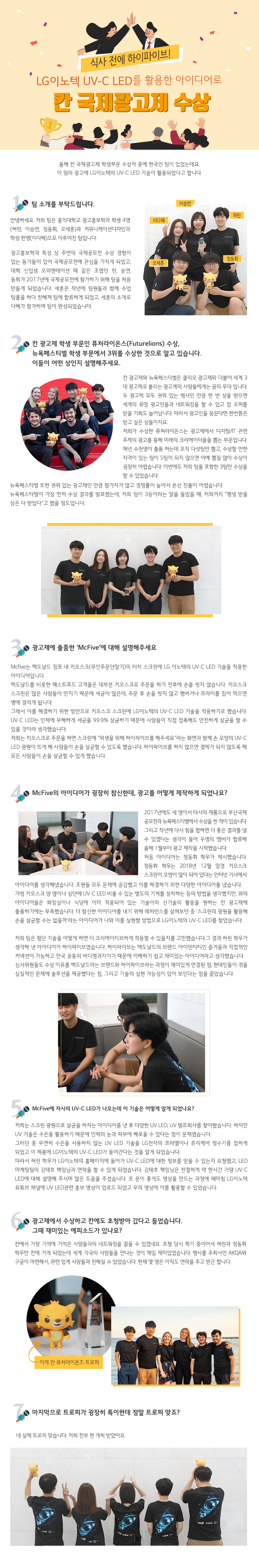 맥도날드를 비롯한 패스트푸드 고객들은 대부분 주문을 위해 키오스크로 주문을 하게 되는데요. 많은 사람들이 만지게 되는 키오스크의 스크린은 세균이 많을 수 밖에 없는데, 주문 후 손을 씻지 않고 햄버거나 프라이를 집어먹으면 위생에 좋지 않다는 점을 관철하여 인체에 무해하게 세균을 99.9% 살균할 수 있는 LG이노텍의 UV-C LED 기술을 키오스크에 적용시켜 ‘위생을 위해 하이파이브를 해주세요’라는 화면과 함께 손 모양의 UV-C LED 광원이 뜨게 해 사람들이 손을 살균할 수 있도록 하는 아이디어를 냈다고 합니다 :) 언젠가는 정말 Mcfive를 할 수 있는 날이 오지 않을까요?