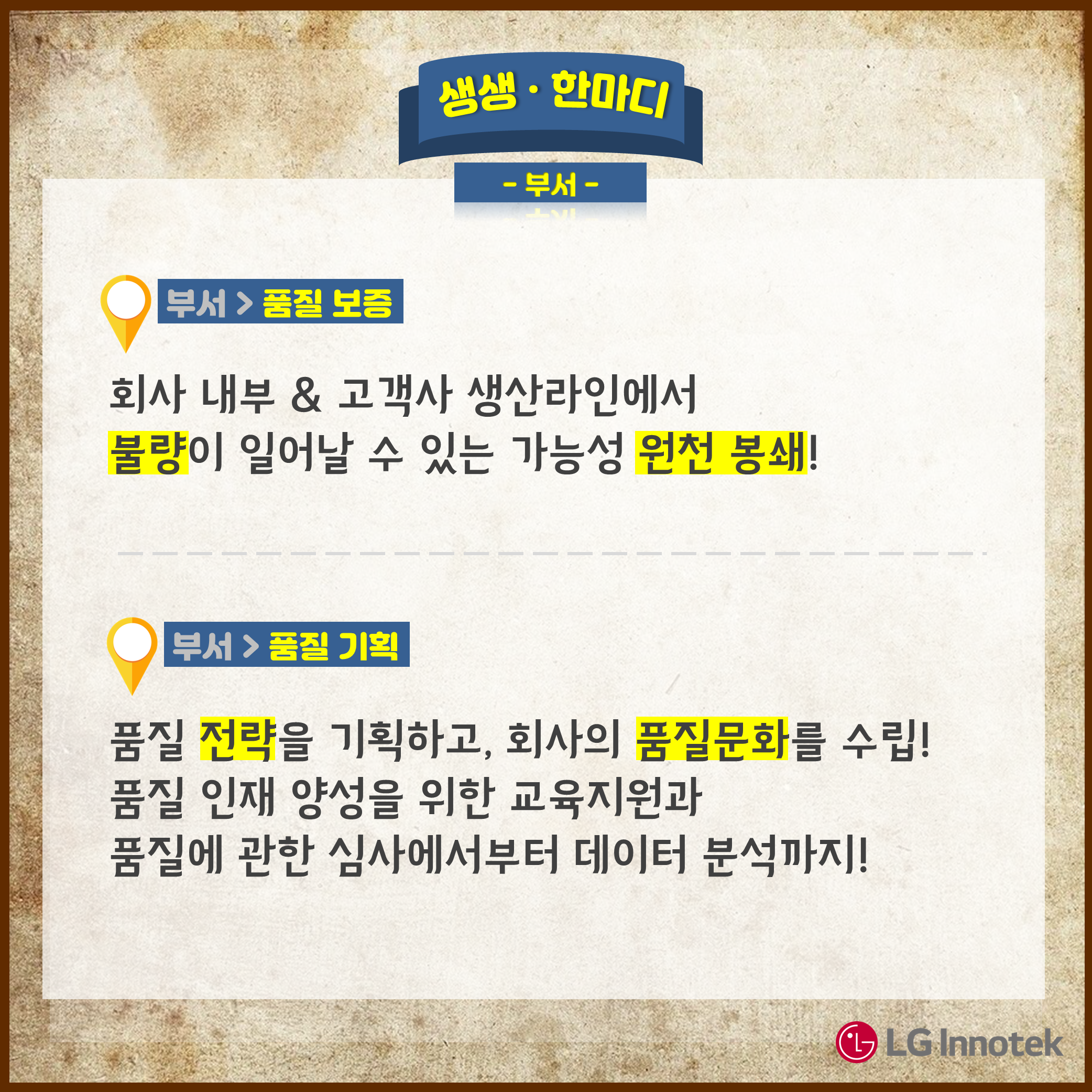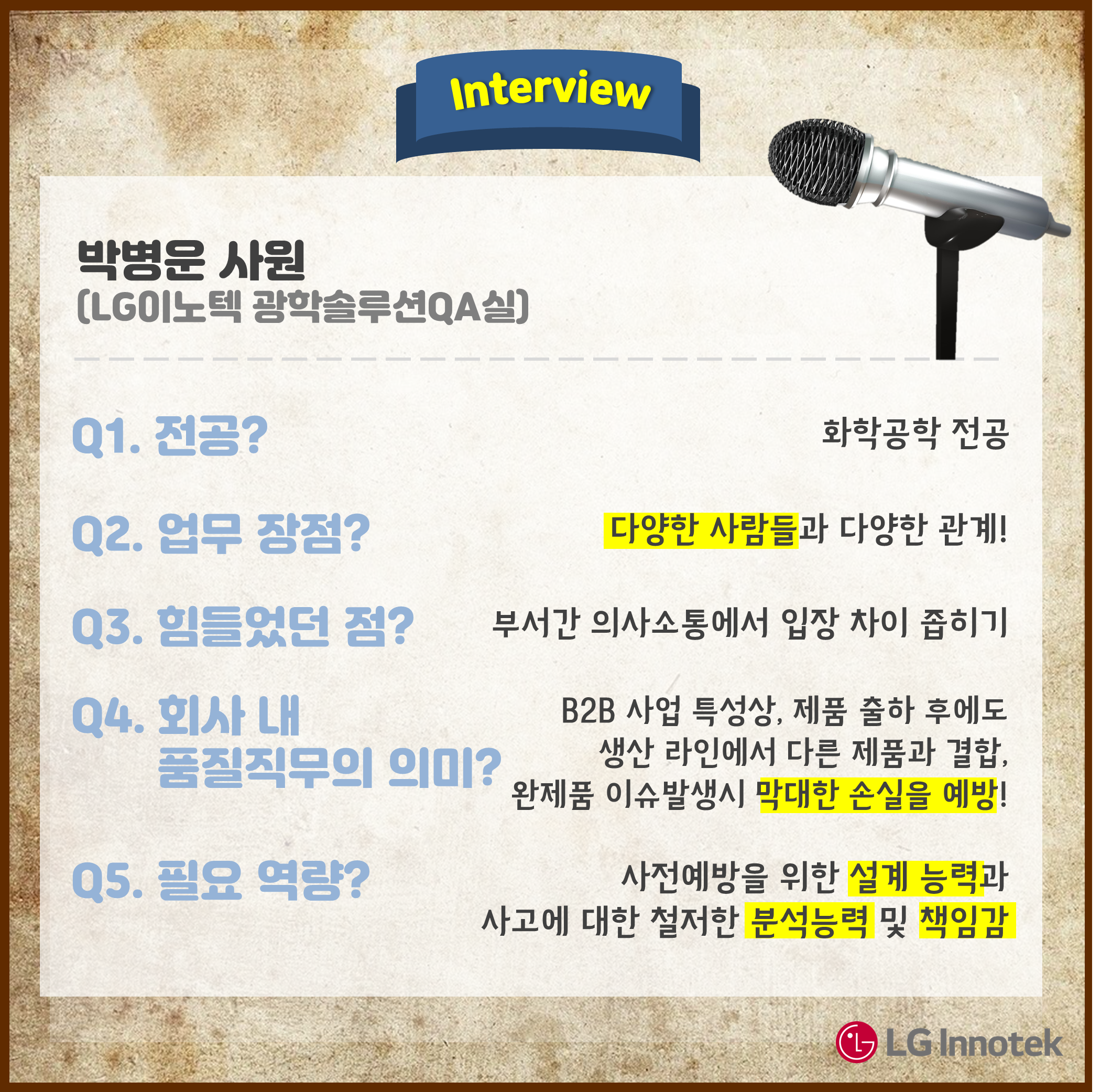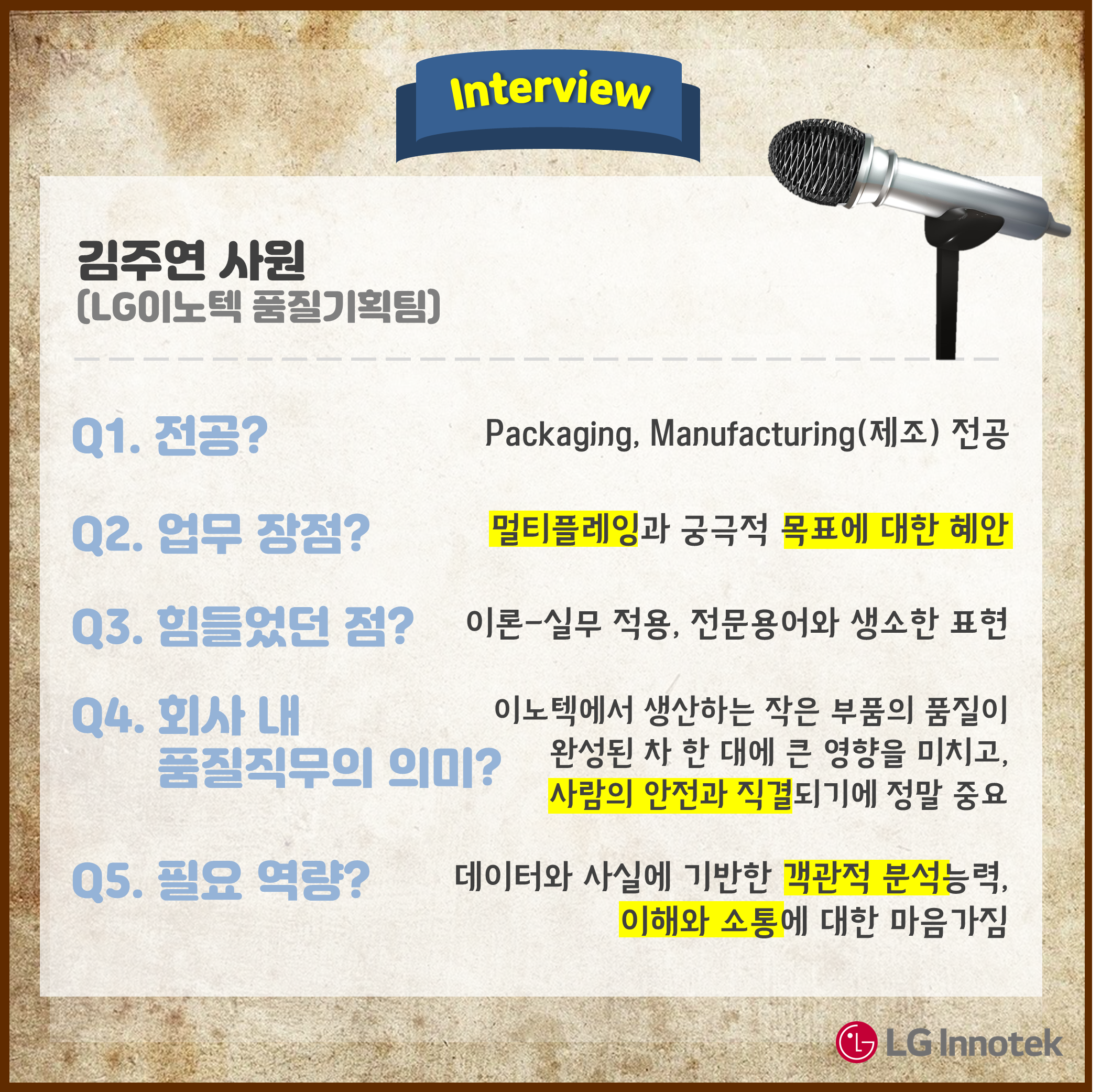 먼저, LG이노텍 품질기획팀 김주연 사원께서 5가지 질문에 답하신 내용을 정리해보았는데요,