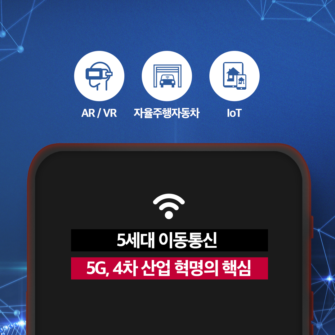 4차 산업 혁명의 기반이 될 필수적인 기술이라고 할 수 있는 5세대 이동통신(5G), 5G는 현재 상용화 되어있는 LTE의 속도보다 약 20배 정도 빠른 속도로 2GB의 영화를 1초만에 받을 수 있는 속도를 가졌는데요. 5G의 대단한 점은 전송량과 전송 속도가 급격히 업그레이드되면서 우리의 일상생활을 변화시킬 수 있게 된 것이지요.