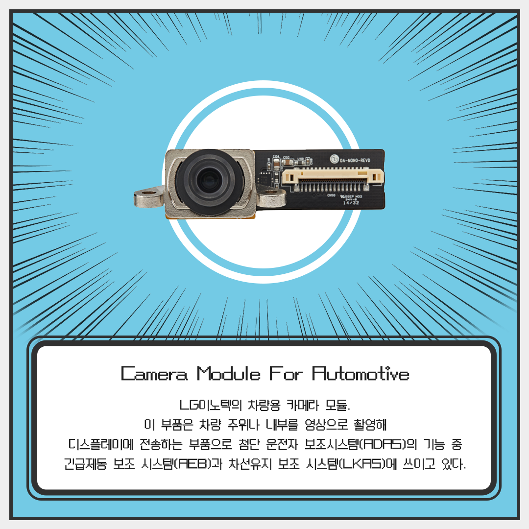 Camera Module For Automotive는 LG이노텍의 차량용 카메라 모듈로써 차량 주위나 내부를 영상으로 촬영해 디스플레이에 전송하는 부품으로 첨단 운전자 보조 시스템(ADAS)의 기능 중 긴급제동 보조 시스템(AEB)과 차선유지 보조 시스템(LKAS)에 쓰이고 있답니다!