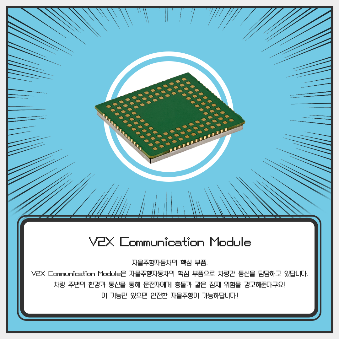 V2X Communication Module은 자율주행자동차의 핵심 부품으로 차량 간 통신을 담당하고 있답니다. 차량 주변의 환경과 통신을 통해 운전자에게 충돌과 같은 잠재 위험을 경고해준다구요!