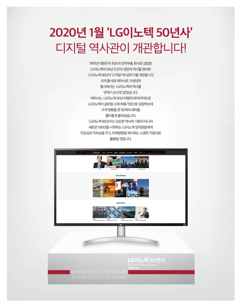 2020년 1월 20일. LG이노텍 창사 50주년을 맞아 1년간 기획된 'LG이노텍 50년사' 디지털 역사관이 개관했습니다. 1970년 대한민국 최초의 전자부품회사로 설립된 LG이노텍의 50년간의 도전과 성장의 역사를 정리하여 디지털 역사관을 만들었는데요. 디지털 역사관은 아래 주소를 통해 모바일, PC 어디서든 접속이 가능합니다. ‘LG이노텍 50년사’는 크게 통사와 테마사로 구성 되며 통사에서는 LG이노텍의 역사를 연대기 순으로 볼 수 있습니다. 또한 테마사에서는 50년 여정 중 LG이노텍이 글로벌 소재.부품 기업으로 성장하는데 크게 영향을 준 50개의 테마를 흥미롭게 풀어냈습니다. 이 밖에도 연혁화보, 현황화보 등을 통해 다양하고 흥미로운 LG이노텍 50년 역사의 사진과 내용들을 확인할 수 있습니다. 디지털 역사관 내 e-Book 메뉴를 클릭하면 실제 책자와 동일한 지면의 내용을 볼 수 있습니다.