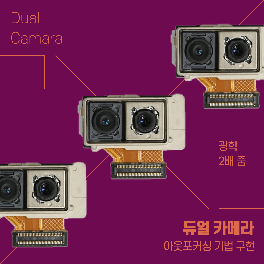 LG이노텍이 듀얼 카메라 모듈은 표준화각(화각77도)와 망원화각(42도)를 장착하여 시차를 기반으로 깊이 정보를 추출하여 아웃포커스 기법을 보다 정확하게 구현한다는 특징이 있습니다. 이러한 특징으로 진정한 의미에서의 듀얼 카메라를 첫 개발했다는 평가를 받았습니다.