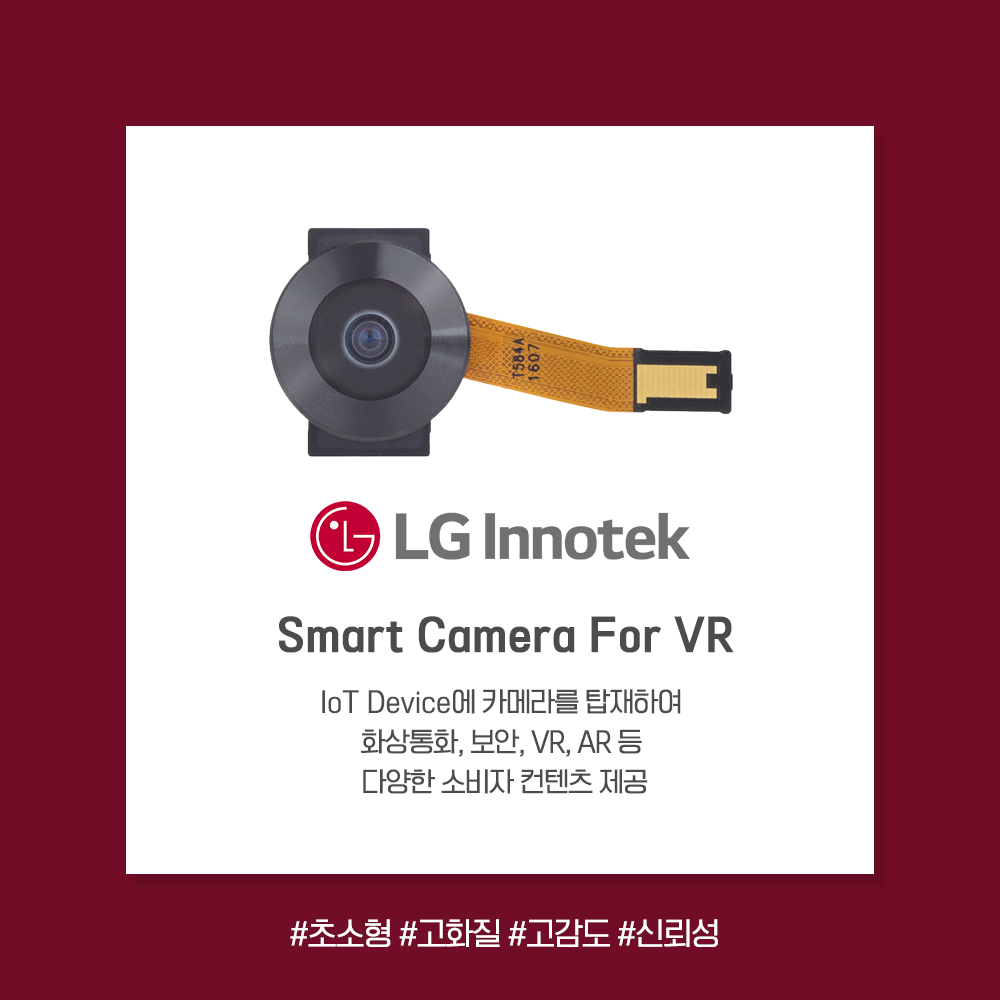 LG이노텍의 ‘Smart Camera For VR’은 IoT Device에 카메라를 탑재하여 화상통화, 보안, VR, AR 등 다양한 소비자 컨텐츠를 제공하는 부품이랍니다! 초소형, 고화질, 고감도, 신뢰성이라는 특장점을 가지고 있어서 보다 높은 품질의 VR 콘텐츠 제작이 가능해요.