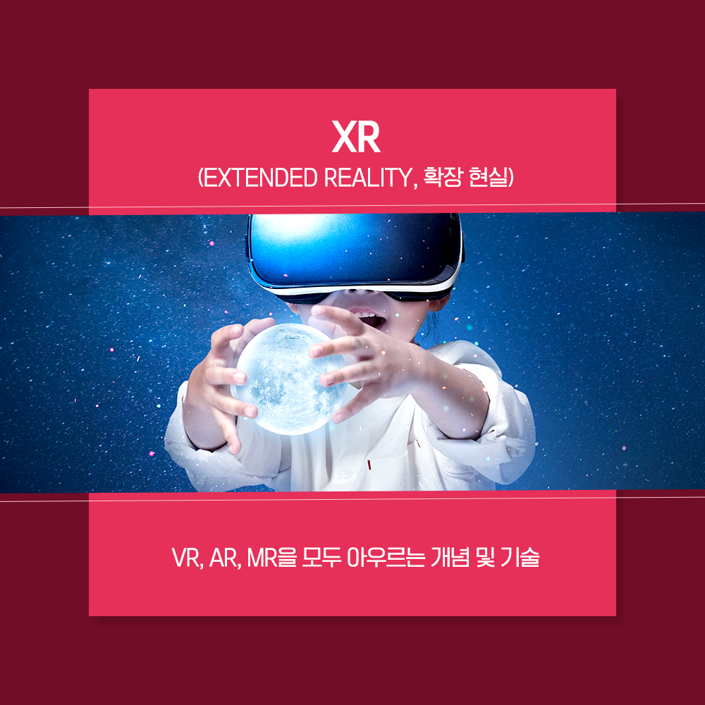 ‘XR(eXtended Reality, 확장 현실)’ 은 VR, AR, MR을 모두 아우르는 개념 및 기술입니다. 가상 공간을 기반으로 한 다양한 기술들이 조화롭게 구성되었기 때문에 가상이지만 현실만큼이나 생생한 체험이 가능하죠!