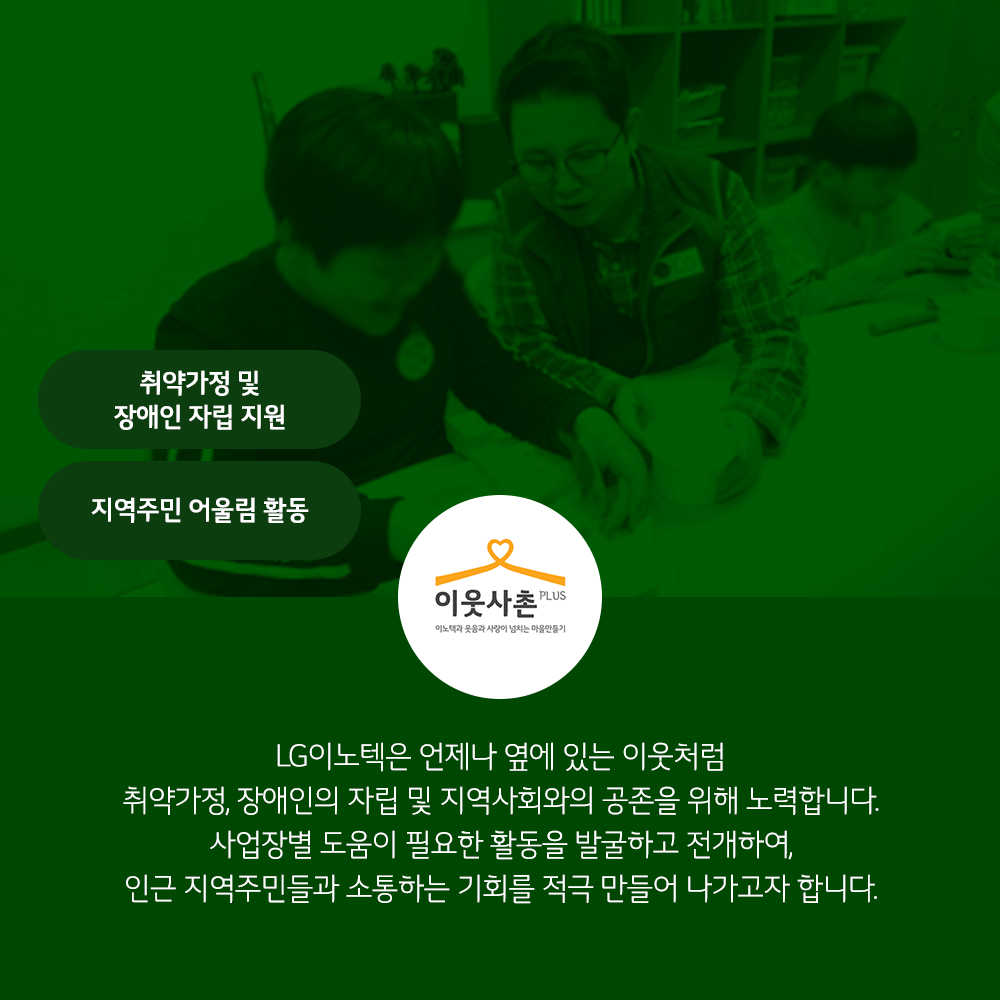 LG이노텍은 언제나 옆에 있는 이웃처럼 취약가정, 장애인의 자립 및 지역사회와의 공존을 위해 노력하고 있습니다. 사업장별 도움이 필요한 활동을 발굴하고 전개하여, 인근 지역주민들과 소통하는 기회를 적극 만들어 나가고자 합니다.