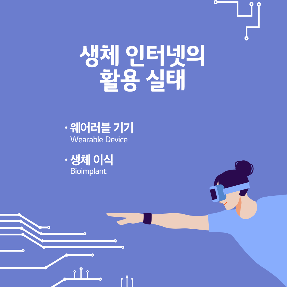 생체 인터넷은 웨어러블 기기(Wearable Device)로 제작되어 착용하거나 기기를 생체 이식(Bioimplant)하여 이용하는 것이 대부분입니다. 기기를 통해 감지된 생체정보 데이터는 유무선으로 의사에게 실시간으로 전달되어 건강을 유지하는데 도움을 주거나 위험 상황을 사전 감지하여 생명을 구하는 일에 사용됩니다.