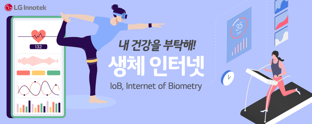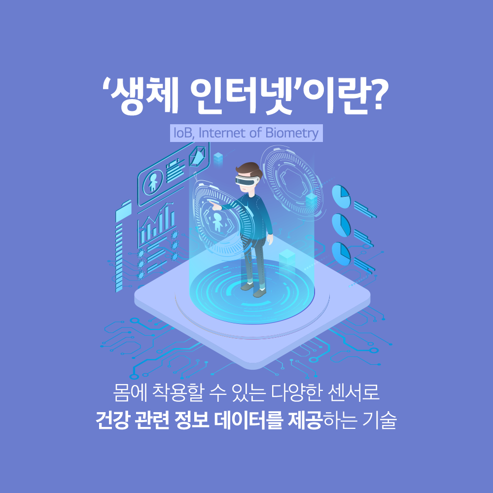 ‘생체 인터넷(IoB, Internet of Biometry)’은 몸에 착용 가능한 다양한 센서(Sensor)로 감지한 건강 관련 생체정보를 전달받을 수 있는 기술입니다. 감지할 수 있는 생체정보에는 혈당, 혈압, 심장 박동, 심전도, 수분, 영양, 호흡, 산소포화도 등이 있으며 사용자는 모바일이나 *웨어러블 기기로 전달받은 데이터를 토대로 건강을 유지하거나 위험 상황을 예방할 수 있습니다.