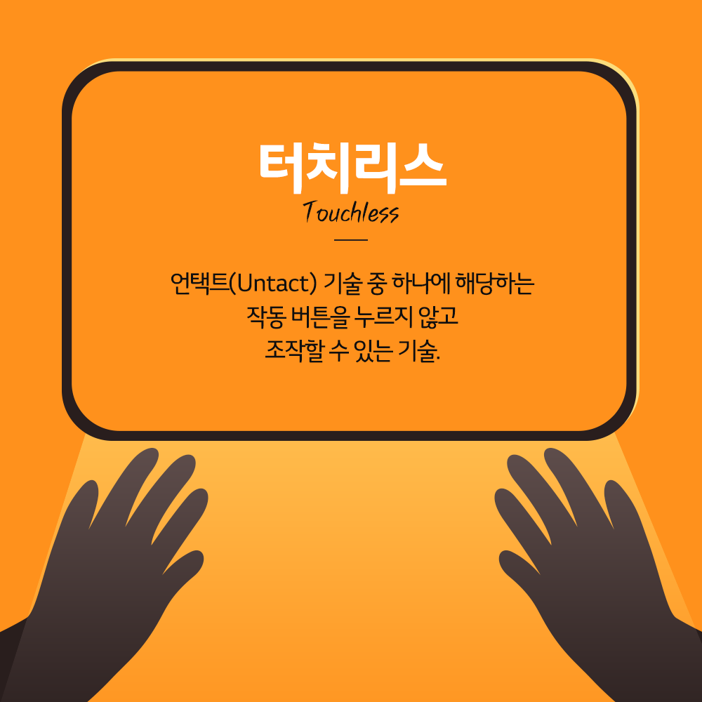 ‘터치리스(Touchless)’는 영단어 ‘Touch(만지다)’와 영문 접미사 ‘-less(~하지 않는)’의 합성어로 ‘비접촉식의’라는 뜻을 가지고 있는 단어이며, 보편적으로 작동 버튼을 누르지 않고 조작할 수 있는 기기나 기술을 지칭합니다.