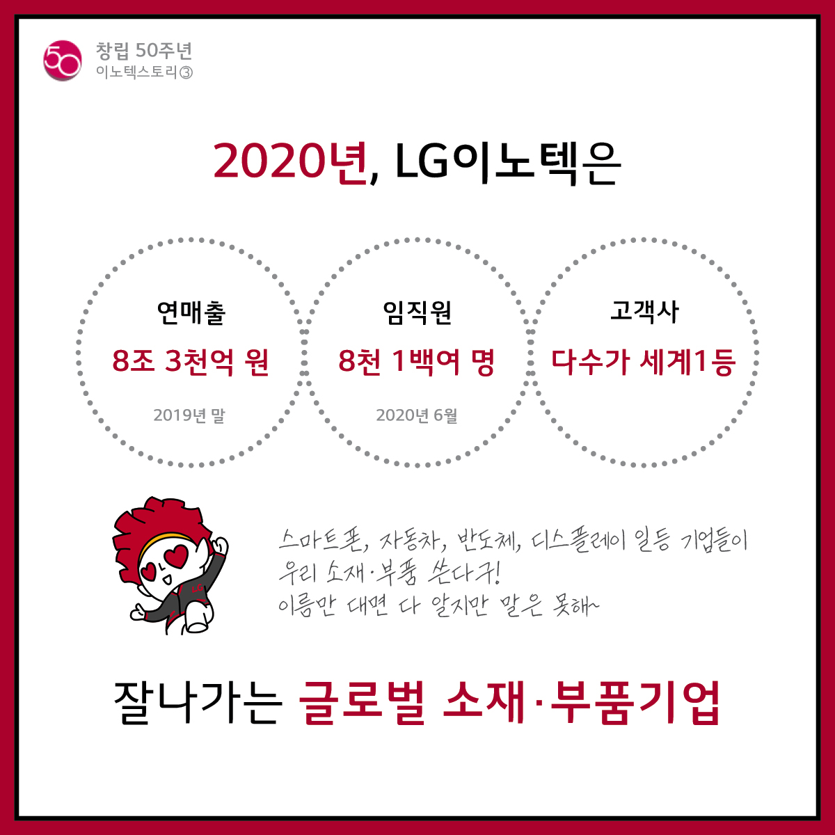 2020년, LG이노텍은 연매출 8초 3천억 원, 임직원 8천 1백여 명, 고객사 다수가 세계1등