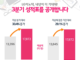 ■ 2017년 3분기 매출 1조7,872억 원, 영업이익 559억 원 – 전년 동기比 매출 29.1%, 영업이익 171.9% 증가 – 전분기比 매출 33.4%, 영업이익 71.9% 증가 ■ 카메라모듈 실적 견인, 전장부품•기판소재 신제품 선방 LG이노텍(대표 박종석, 011070)이 지난 3분기에 전년 동기 및 전분기 대비 큰 폭으로 향상된 실적을 기록했다. 스마트폰용 카메라모듈의 신모델 공급 확대와 전장부품 및 기판소재사업의 신제품 판매 증가에 따른 결과다. LG이노텍은 한국채택 국제회계기준(K-IFRS)으로 2017년 3분기 매출 1조7,872억 원, 영업이익 559억 원을 기록했다. 전년 동기 대비 매출은 29.1%, 영업이익은 171.9% 늘어났다. 전분기 대비해서는 매출이 33.4%, 영업이익이..